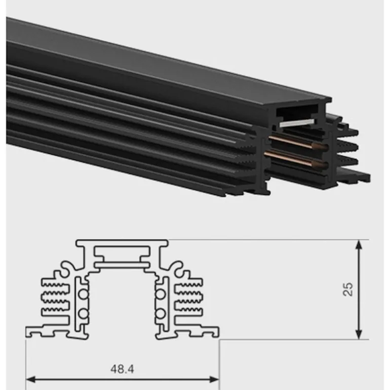Szyna wpuszczana charakteryzuje się napięciem zasilania 48V oraz kompaktowymi wymiarami: długość 100 cm, szerokość 4.8 cm i wysokość 2.5 cm, co pozwala na jej dyskretne ukrycie w suficie, zapewniając jednocześnie pełnię funkcjonalności. Dostępna w dwóch klasycznych kolorach, czarnym i białym, doskonale wkomponuje się w różne typy aranżacji wnętrz.