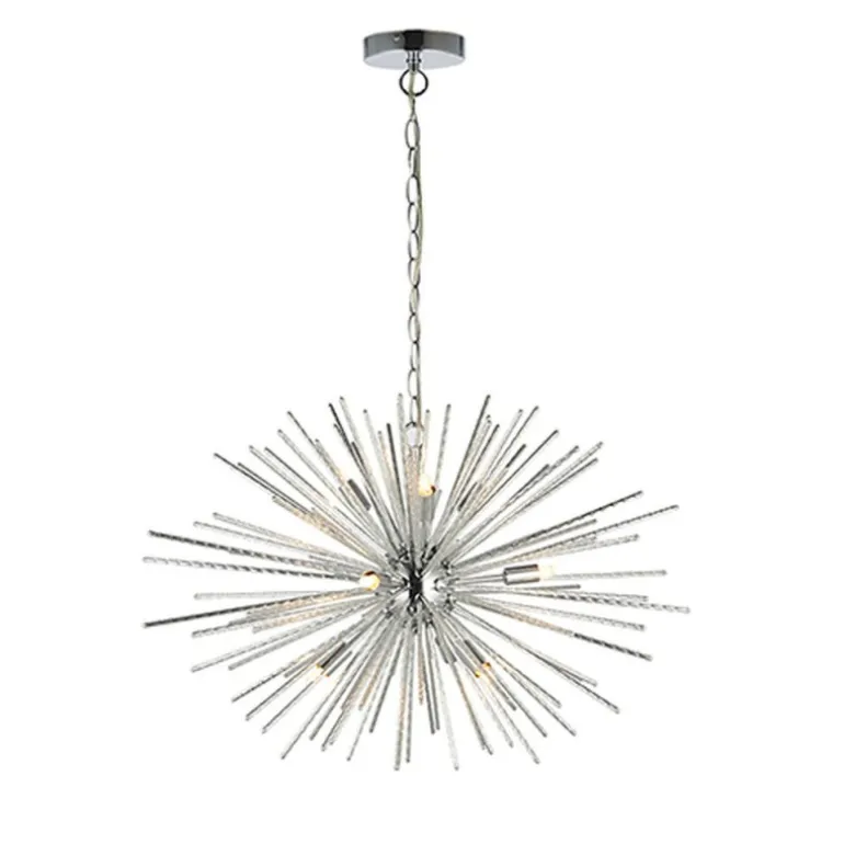 Lampa wisząca znanej marki Endon Lena to nowoczesna wersja ponadczasowej klasyki z przeszłości. Wykończona wypolerowanym chromem z „eksplozją” teksturowanych prętów, które tworzą dramatyczne wzory świetlne. Lampa na łańcuchu z możliwością regulowania wysokości. Przystosowana do ściemniania i świetnie współpracuje z żarówkami typu LED.