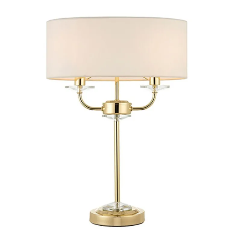 Lampa biurkowa znanej marki Endon Nixon, którego główną cechą jest efektowne wykończenie złotem lub niklem. Uzupełnieniem ramion jest nuta kryształu, a na ich końcach znajduje się delikatny, biały, o strukturze jedwabiu abażur. Świetnie współpracuje z żarówkami typu LED.