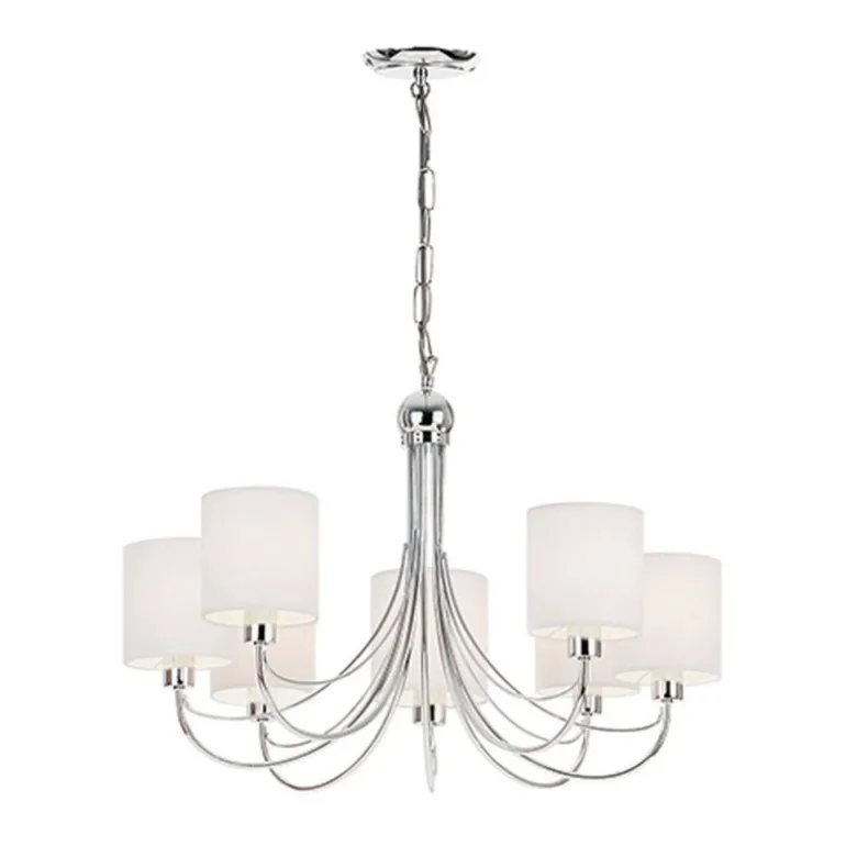 Żyrandol znanej marki Endon Phantom, którego główną cechą jest efektowne wykończenie polerowanym chromem i białe abażurki. Lampa z możliwością regulowania wysokości. Przystosowana do ściemniania i świetnie współpracuje z żarówkami typu LED.