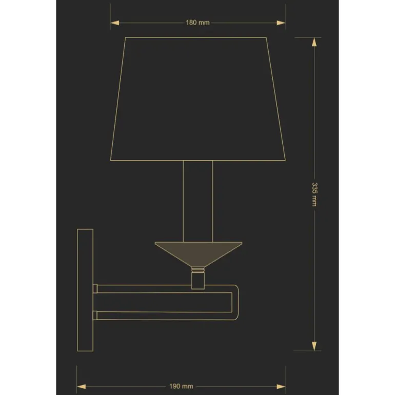 Lampa posiada jedno źródło światła z gwintem E14, co pozwala na zastosowanie różnorodnych żarówek. Kinkiet ma wymiary: szerokość 18 cm, wysokość 33,5 cm i głębokość 19 cm, co sprawia, że jest kompaktowy, a jednocześnie wystarczająco duży, by skutecznie oświetlić przestrzeń.