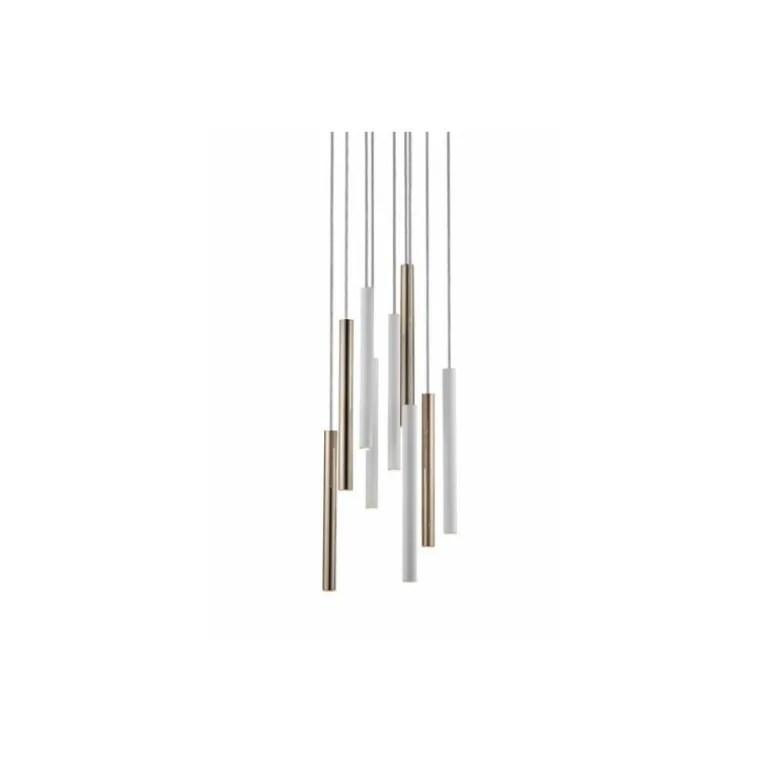 Lampa wisząca Zuma Line Loya 09C Multikolor w wersji dziewięciu delikatnych tubek zawieszonych na jednym talerzu. Kolory tub to mieszanka złotego, miedzi oraz białego. Talerz mocujący w kolorze chromu. Każda z tubek posiada wbudowany LED o mocy 5W. Polecamy taką lampę do komfortowego oświetlenia stołu.
