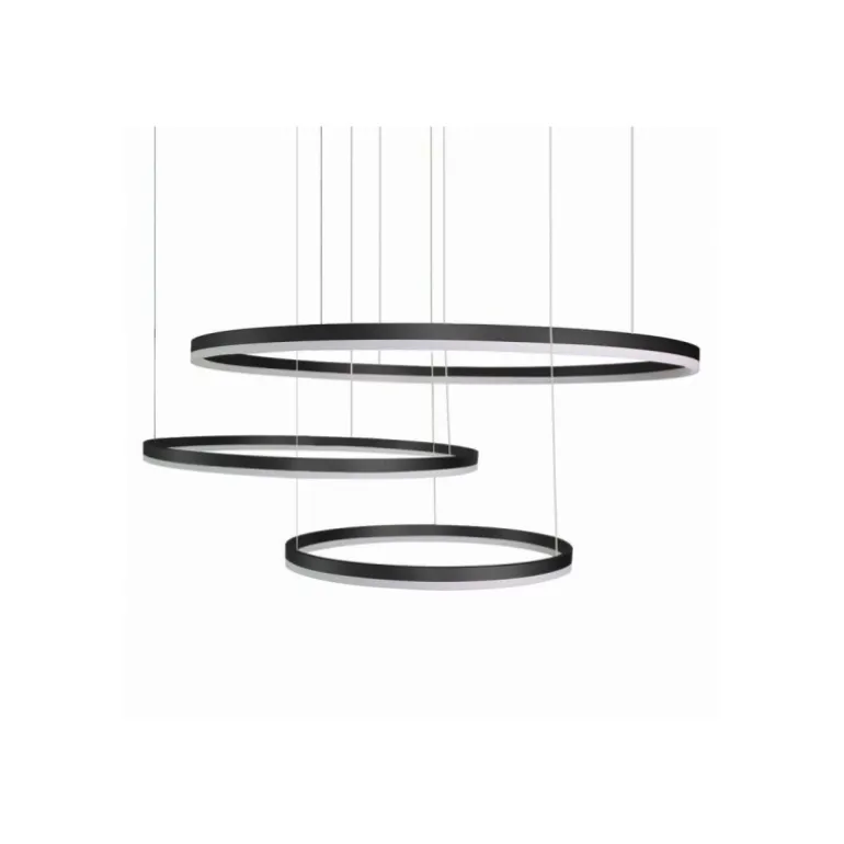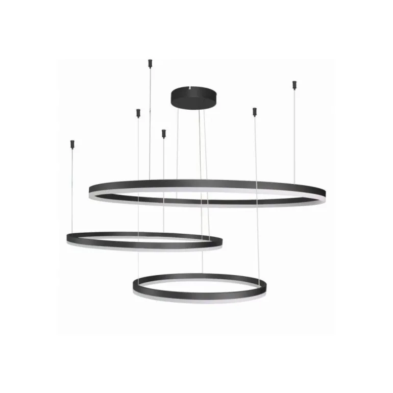 Jej smukła konstrukcja o wysokości 4 cm oraz długości 250 cm sprawia, że lampa jest doskonałym wyborem do salonów, jadalni oraz przestronnych korytarzy. Trzy różne rozmiary pierścieni (100 cm, 80 cm, 60 cm) tworzą harmonijną kompozycję, nadając pomieszczeniu nowoczesny i dynamiczny wygląd.