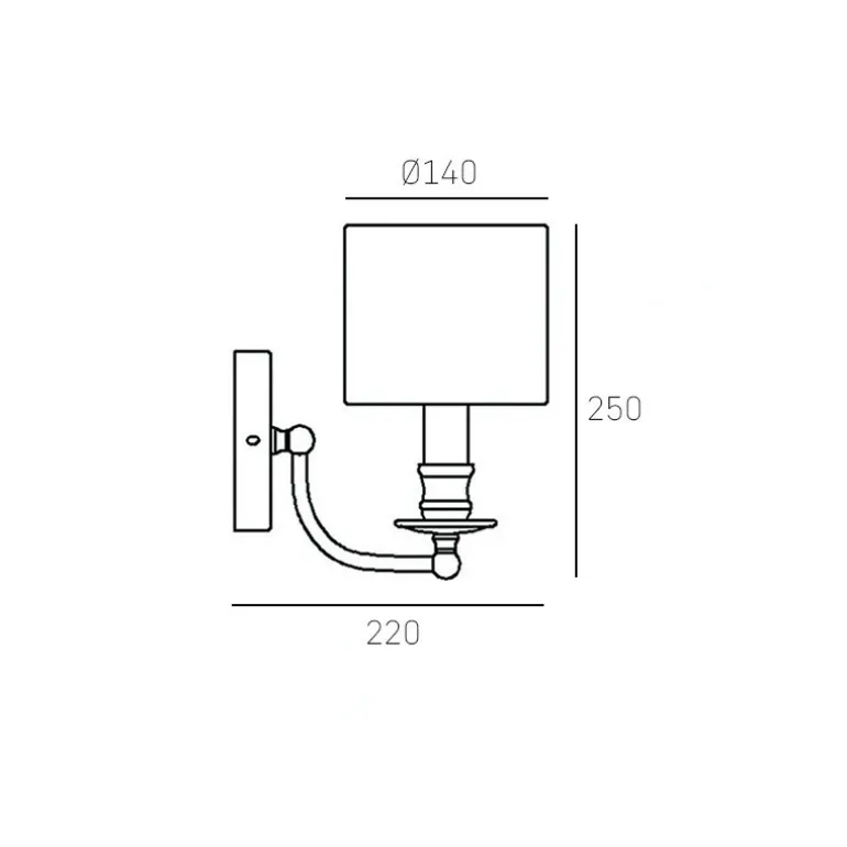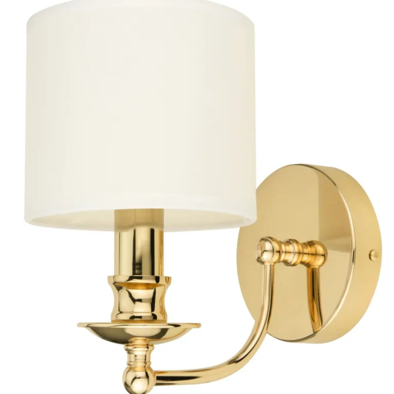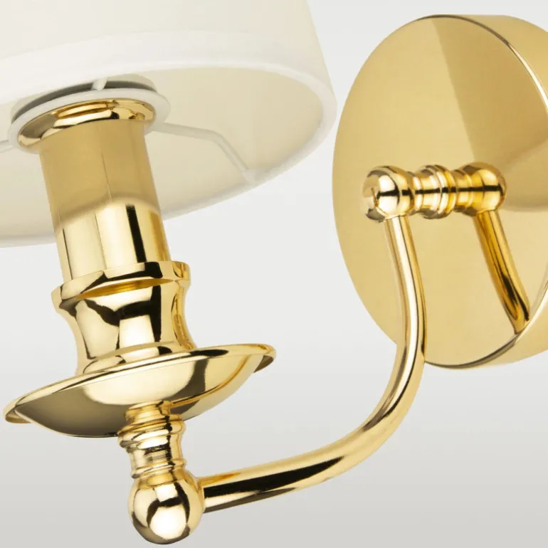 Kinkiet posiada wykończenie w kolorze złotym, co nadaje mu luksusowego charakteru. Lampa jest wyposażona w pojedyncze źródło światła o typie żarówki E14, zasilane standardowym napięciem 230 V. Biały abażur kontrastuje ze złotą bazą, tworząc harmonijną kompozycję, która przyciąga wzrok.