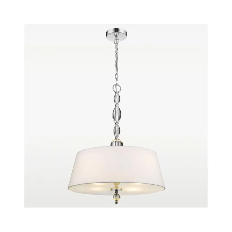 Lampa wisząca Cosmo Light Cancun spodoba się zwolennikom kryształu oraz abażurów. Posiada ona wymienne źródła światła na popularny gwint E27. Biały abażur został dodatkowo zakryte mlecznym kloszem, dzięki temu nie można bezpośrednio zobaczyć żarówek, a światło jest rozproszone. Lampa Cancun wykonana została z metalu wykończonego chromem. Z racji tego że całość wisi na łańcuchu można w łatwy sposób dostosować wysokość lampy podczas jej montażu. Będzie świetnie pasować do salonów, sypialni oraz jadalni.