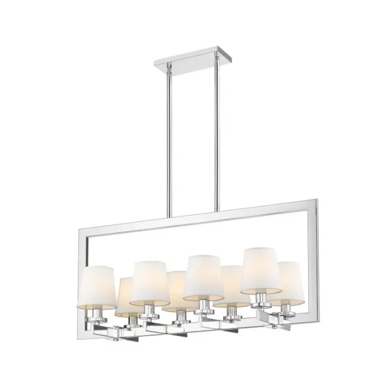 Lampa wisząca – żyrandol z kolekcji firmy Cosmo Light. Osiem abażurków z białej tkaniny w dekoracyjnej, chromowane ramie, nawiązuje do stylu nowojorskiego. Dosyć duża lampa wymaga dużej przestrzeni lub dużego stołu.