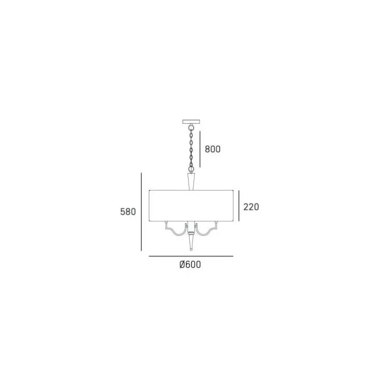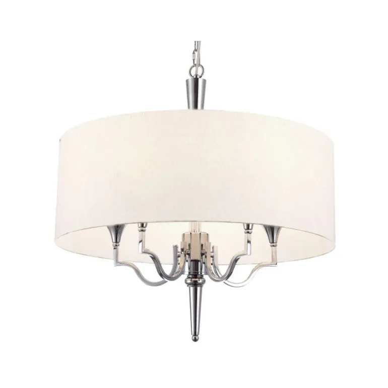 Żyrandol klasyczny Cosmo Light Washington łączy w sobie to, czym szczycą się Amerykanie – luksus i nowoczesność bazującą na materiałach najwyższej jakości. Posiada biały tkaninowy abażur w kształcie otwartego od góry i w dół walca o średnicy 60 cm, z którym kontrastują gładkie powierzchnie korpusu wykonanego ze stali szlachetnej. Smukły korpus lampy zgrabnie rozgałęzia się na pięć ramion, które przybrały bardzo charakterystyczny kształt krawędzi marokańskiej koniczyny, bardzo popularnego elementu w nowojorskim wzornictwie. Lampa wisząca Cosmo Light Washington została podwieszona na ażurowym łańcuchu o dużych oczkach, wykonanym również ze stali chromowanej.