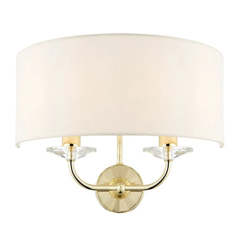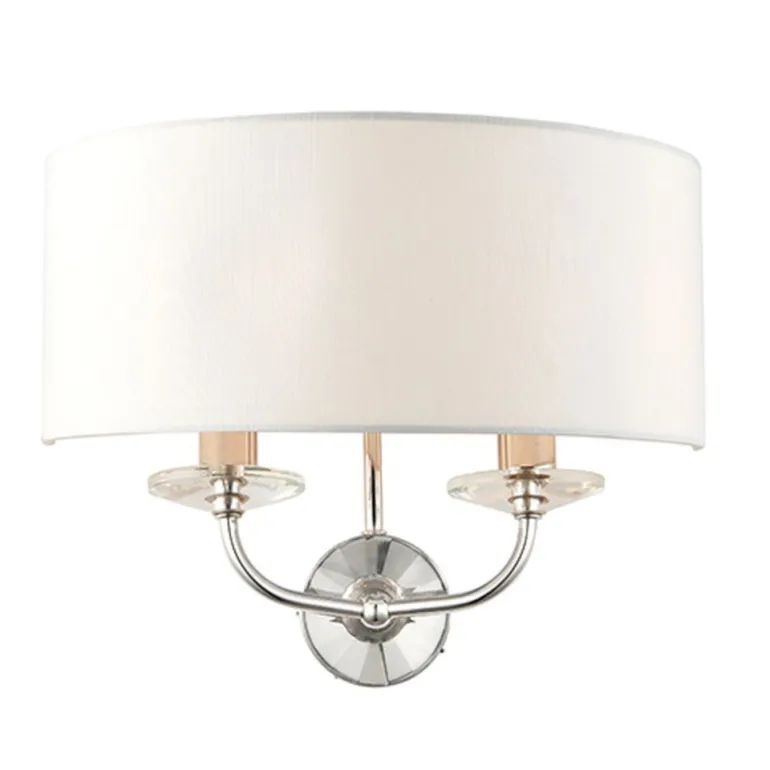 Kinkiet znanej marki Endon Nixon, którego główną cechą jest efektowne wykończenie złotem lub niklem. Uzupełnieniem ramion jest nuta kryształu, a na ich końcach znajduje się delikatny, biały, o strukturze jedwabiu abażur. Przystosowana do ściemniania i świetnie współpracuje z żarówkami typu LED.