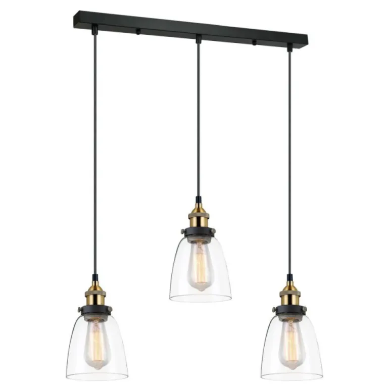Na czarnej listwie, mocowanej bezpośrednio do sufitu (może być sufit podwieszany z karton – gipsu), umieszczono trzy przezroczyste klosze na czarnych kablach. Długość kabli możliwa do regulacji podczas montażu lampy. Elementy metalowe czarne z rozetkami w kloszach w kolorze mosiądzu.
