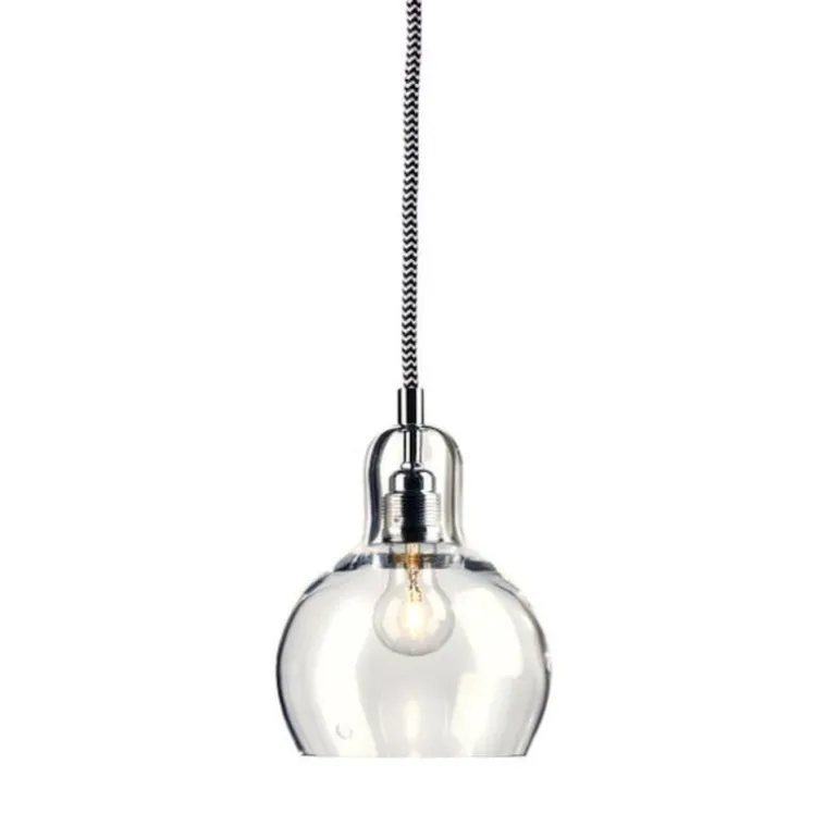 Lampa wisząca Kaspa Longis I, którą kwalifikujemy jako industrialny styl. Klosz lampy wykonany z przezroczystego szkła, oprawa metalowa w kolorze chromu. Do wyboru kilka kolorów przewodów zasilających lampę.