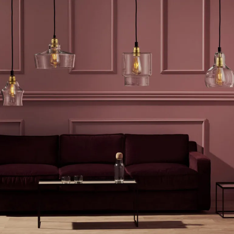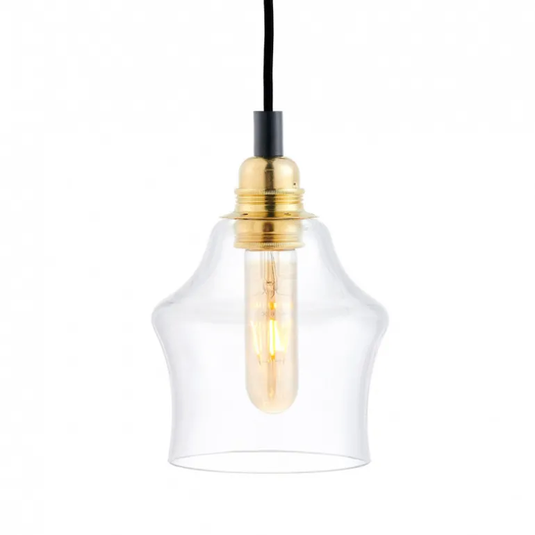Lampa wisząca Kaspa Longis II. Kontynuacja serii lamp wiszących Longis. Styl kwalifikujemy jako industrialny. Klosz lampy wykonany z przezroczystego szkła, oprawa metalowa w kolorze złota. Do wyboru kilka kolorów przewodów zasilających lampę.