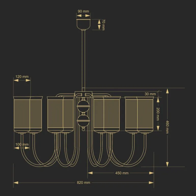 Olzano 8 wyposażona jest w osiem źródeł światła typu E14, co zapewnia równomierne i przyjemne oświetlenie. Lampa jest zasilana prądem o napięciu 230 V. Dzięki imponującej średnicy 82 cm oraz wysokości 70 cm, stanowi prawdziwą ozdobę pomieszczenia, jednocześnie przyciągając wzrok swoją majestatyczną formą.