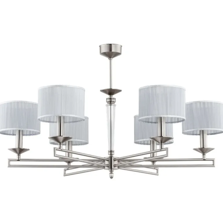 Żyrandol posiada sześć źródeł światła, wykorzystujących żarówki typu E14, co sprawia, że doskonale oświetli nawet większe pomieszczenia. Jego wymiary to 35 cm wysokości, 70 cm długości oraz 77 cm średnicy, dzięki czemu stanie się centralnym punktem każdej przestrzeni. Zasilany jest napięciem 230 V, co gwarantuje stabilną i wydajną pracę.