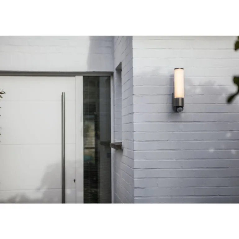 Lampa ta zasilana jest napięciem 230 V i wykończona w eleganckim stalowym kolorze, co sprawia, że pasuje do większości fasad budynków. Dzięki klasie szczelności IP 44, jest odporna na kurz i wodę, co gwarantuje długotrwałą trwałość i bezproblemowe użytkowanie na zewnątrz.