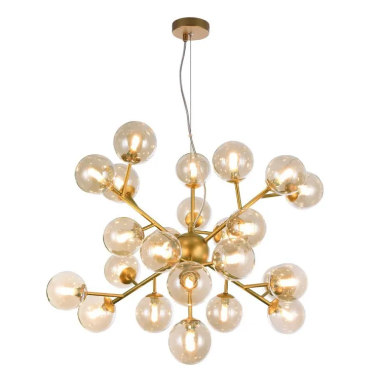 Lampa posiada aż 24 źródła światła, co gwarantuje doskonałe oświetlenie nawet większych pomieszczeń. Jest przystosowana do żarówek typu G9 i zasilana napięciem 230 V. Jej kolor – złoty, nadaje wnętrzu luksusowy charakter, podkreślając jednocześnie nowoczesny design. Regulowana wysokość od 90 do 145 cm pozwala na idealne dopasowanie do każdego pomieszczenia, a średnica lampy wynosząca 65 cm sprawia, że lampa stanowi wyraźny, ale nie przytłaczający element wystroju.